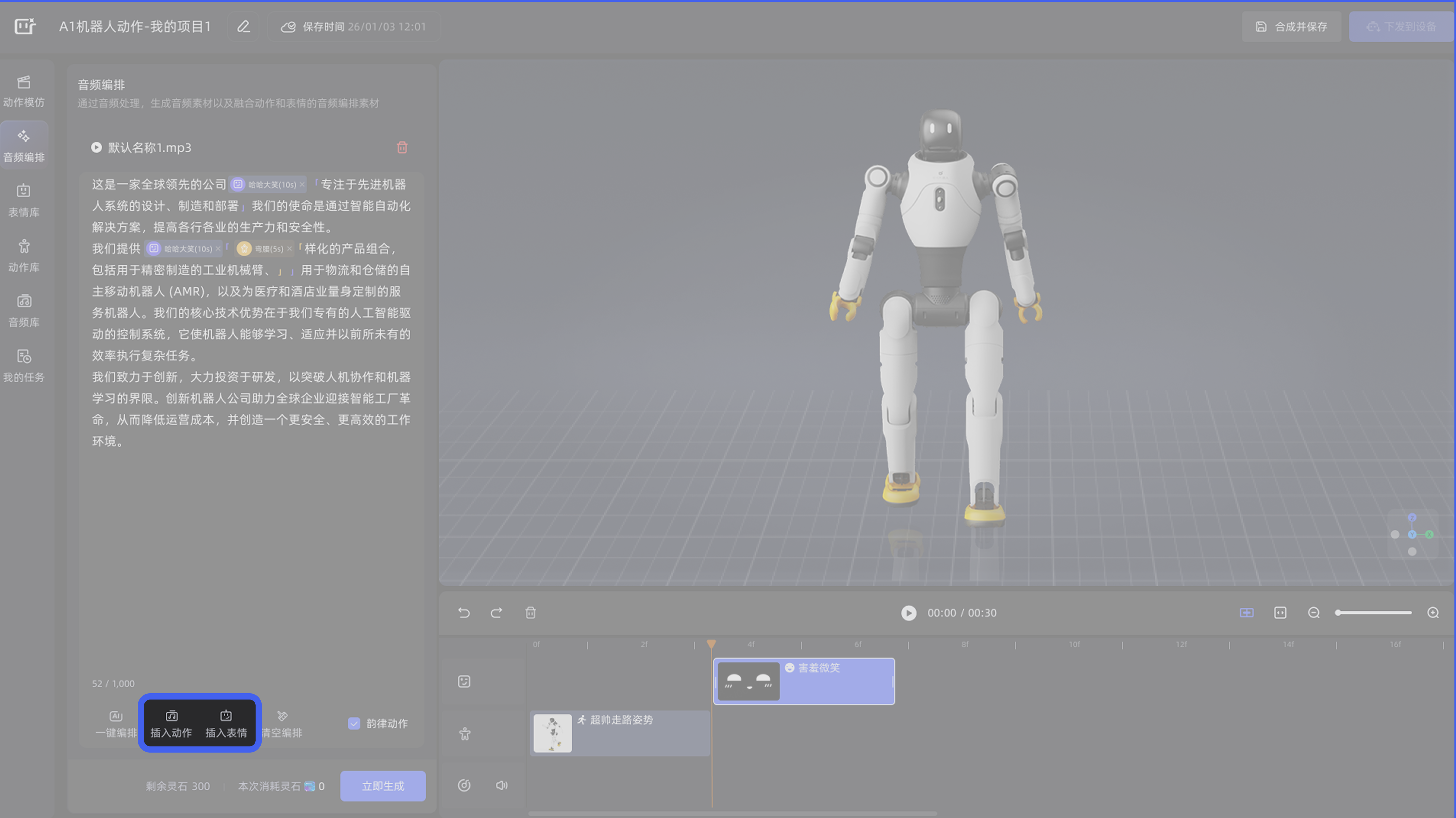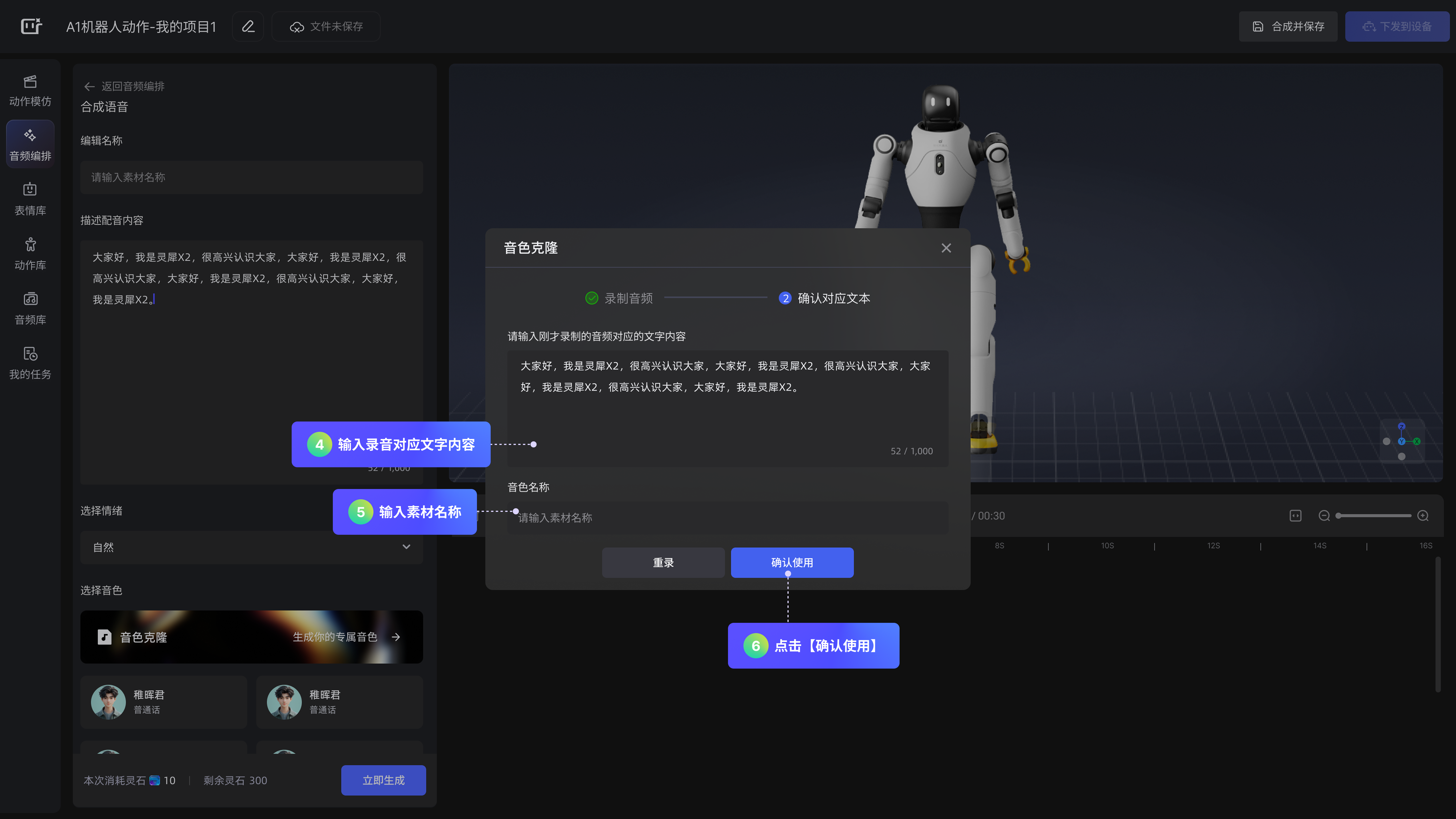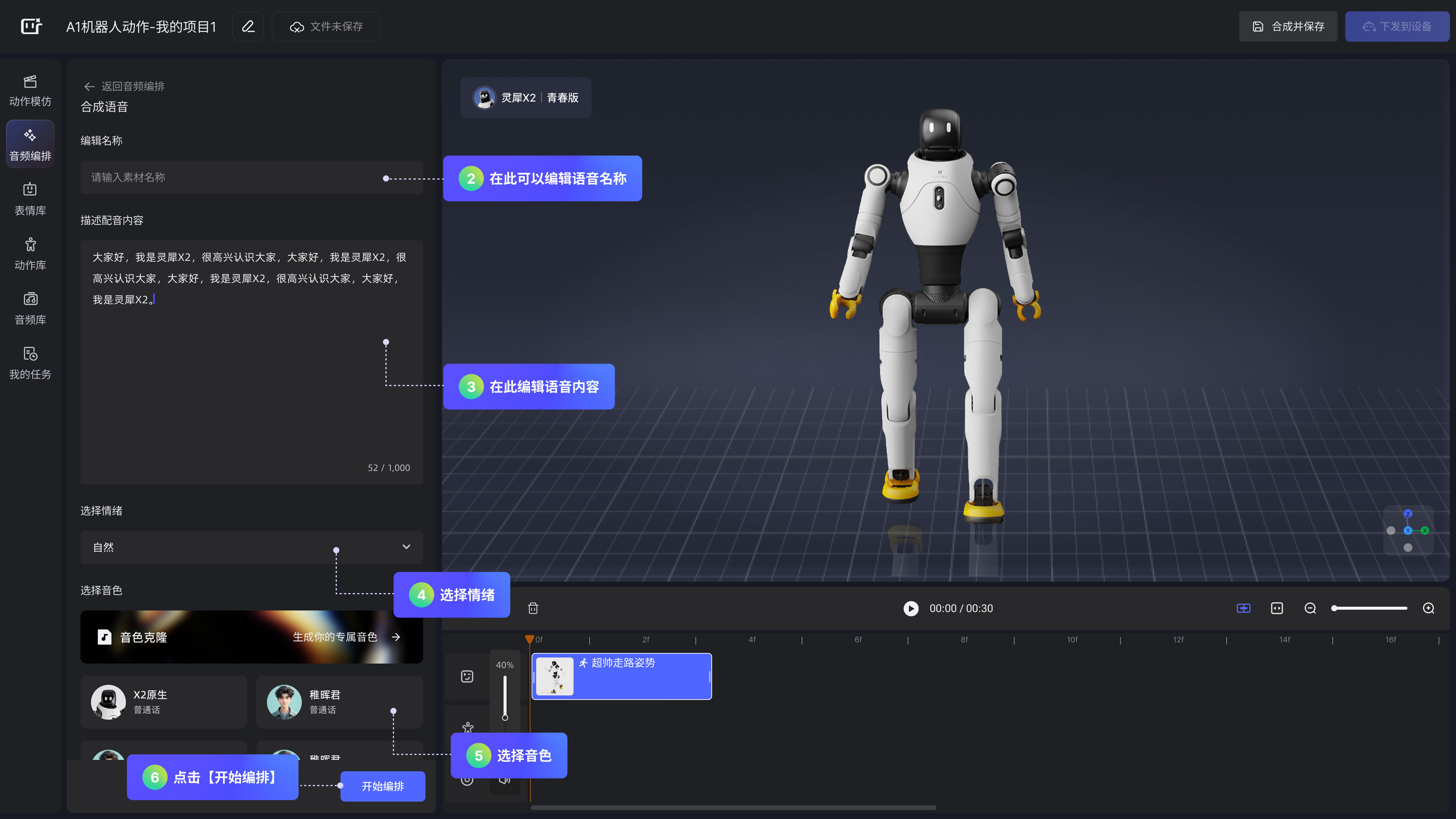 在「选择机型」弹窗点击【确认】按钮后,即可进入「创作主页面」,从零开始构建机器人演绎内容。可自由编排音频、动作与表情,进行个性化创作。