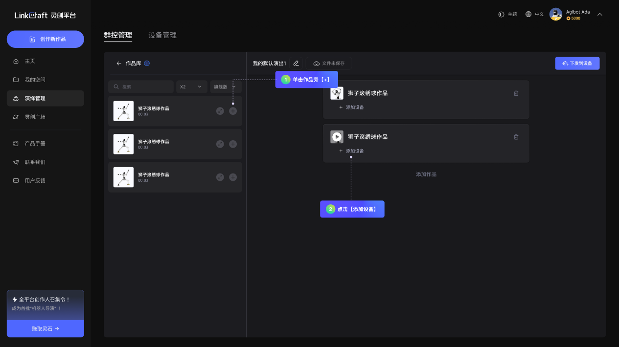 灵创平台围绕机器人的作品获取与创作演绎与设备管理两大核心目标,构建了五大功能模块。各模块既可独立使用,也可组合实现完整创作演绎流程。其核心功能如下: