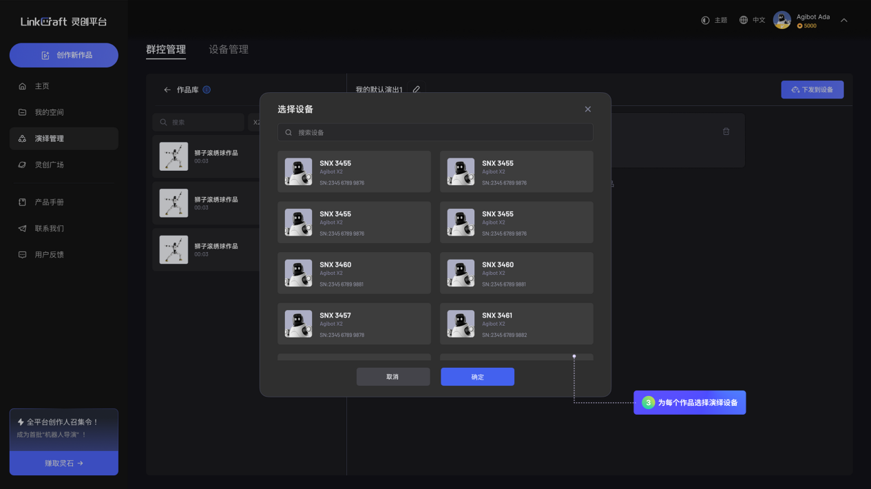 「演绎管理」:内含「设备管理」和「群控管理」两部分功能。「设备管理」用于查看机器人信息,绑定和管理机器人设备;「群控管理」用于创建并管理多设备同步的演绎任务,实现多台机器人协同表演或批量控制。